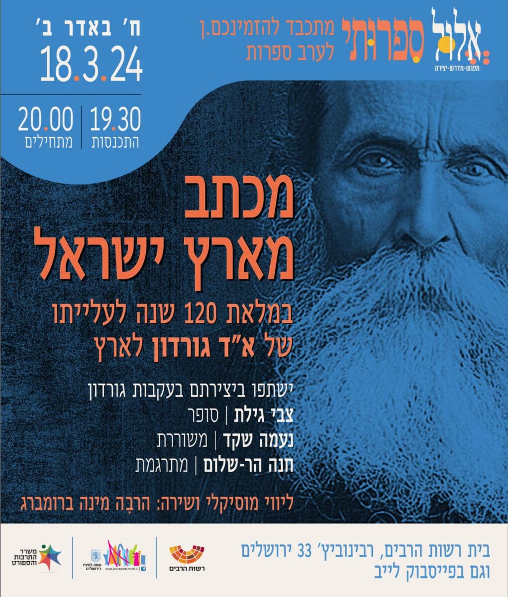 אלול ספרותי מתכבד להזמינכם.ן למפגש ספרות ומוסיקה במלאת 120 שנה לעלייתו של א"ד גורדון לארץ