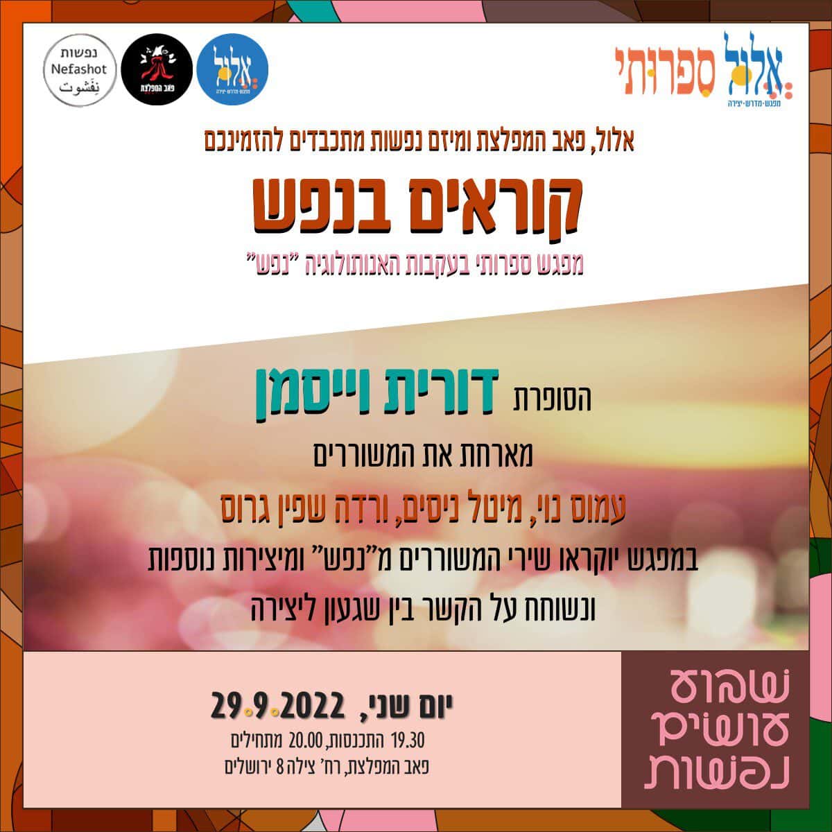 אלול בשיתוף עם מיזם נפשות, באירוע עם המשוררת והעורכת דורית וייסמן על האנתולוגיה "נפש" שערכה. מארחת שלושה משוררים: חיה לוי מתמודדת נפש, המשורר עמוס נוי והמשוררת ורדה שפין גרוס, בערב שכולו התבוננות פואטית על הקשר בין יצירה לשגעון.