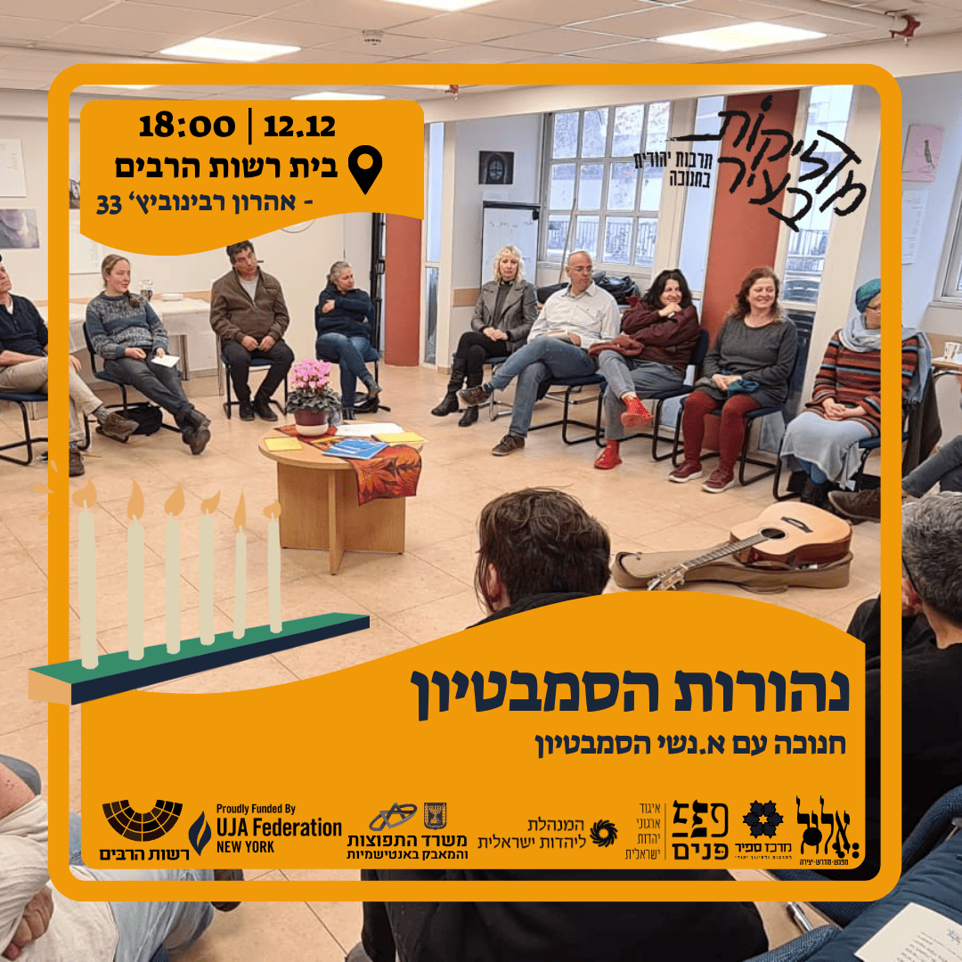קהילת הסמבטיון מבית "אלול" חגגה ביום שלישי נר שישי של חנוכה בחגיגת "נהורות הסמבטיון" בבית רשות הרבים. בימים הכהים-הלא פשוטים שעוברים על כולנו, צריך גם לדעת לייחד בועות של אור, להתעטף בהם ולהדליק אורות, ולו של מילים, אשר יאירו את היום יום ביופיו הפשוט.