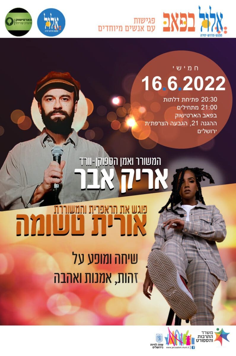 בערב הספרות המשותף ל"אלול" ולפאב "ארטישוק" אריק יספר וישיר על הנושאים שבונים את חיינו: אהבה, זהות, פוליטיקה, אבהות ועוד. במופע הוא יארח את הראפרית אורית טשומה, ובדיאלוג ספרותי משותף הם יכוונו זרקור על ובדיאלוג ספרותי משותף הם יכוונו זרקור על סוגיות חברתיות של זהות, הגירה ופערים חברתיים.