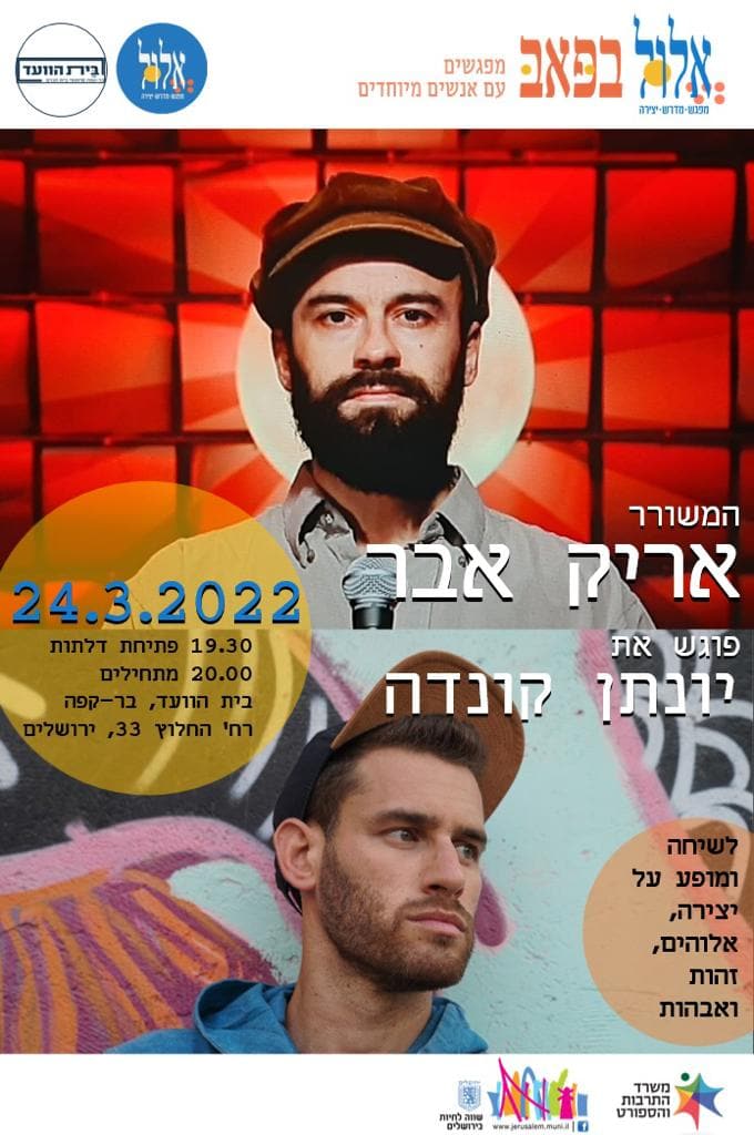 אריק אבר, אמן ספוקן וורד, משורר, יוצר הפואטרי-סלאם (ענף של ספוקן־וורד הבנוי כקרב של הקראת שירה). ממחברי הספר "בקול רם!" (עורכים: אריק אבר, נילי קופלר ונעמה לופו, עורכת ספרותית: ורד אריאל־נהרי). בערב הספרות המשותף ל"אלול" ולפאב "בית הועד" אריק יספר וישיר על הנושאים הבונים את חיינו: אהבה, זהות, פוליטיקה, אבהות ועוד. במופע הוא יארח את המשורר ואמן הפואטרי סלאם יונתן קונדה, ובדיאלוג ספרותי משותף הם יכוונו זרקור על אבהות, שירה ועניינים שבלב.